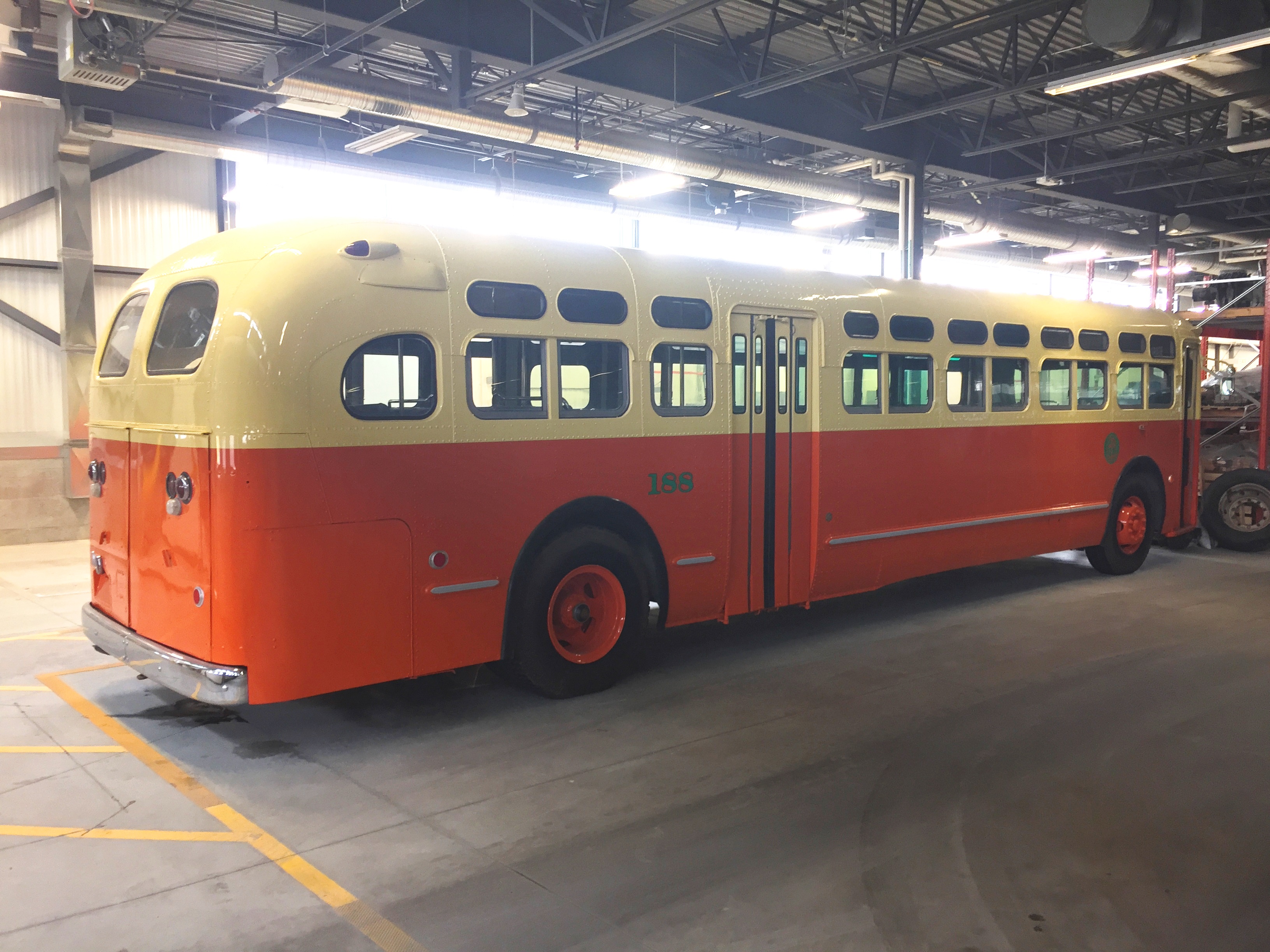 1954 General Motors “Old Look” bus # 188 in its new colours and livery. Having been manufactured in Detroit and then delivered to Los Angeles. Then worked its way from Los Angeles up to Sacramento, then onto Victoria, BC and into Regina, Saskatchewan. Finally, it found a new home in Winnipeg as the MTHA’s vintage bus # 188 representing the “Greater Winnipeg Transit Commission” era.